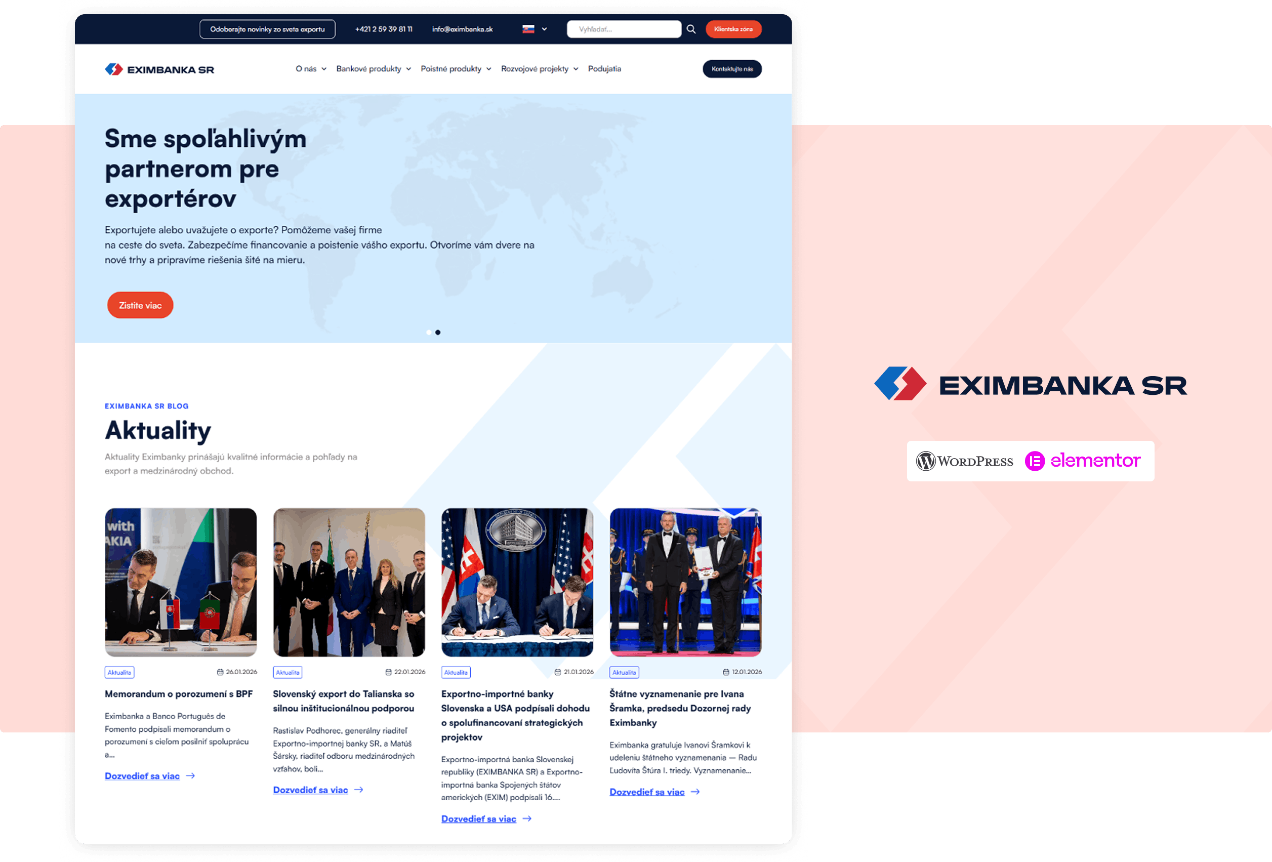 EXIMBANKA SR (Export-Import Bank of the Slovak Republic) is a state export-credit agency whose mission is to support the export of Slovak companies and their competitiveness on foreign markets. The institution provides financial solutions such as loans, guarantees and credit insurance that enable Slovak companies to expand abroad and minimise business risks.